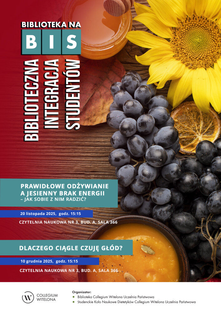 Biblioteka Collegium Witelona Uczelnia Państwowa oraz Studenckie Koło Naukowe Dietetyków Collegium Witelona Uczelnia Państwowa zapraszają na spotkania z cyklu Biblioteka Na BIS - Biblioteczna Integracja Studentów: